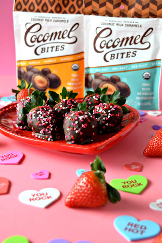 Treat your Valentine to indescribably delicious, dairy free Chocolate Covered Cocomel Bites Strawberries by @justwhatweeat! These vegan friendly, gluten free chocolate covered strawberries will be a hit this Valentine's Day--whether you're making dessert for two, celebrating with friends and family, or making a sweet treat for yourself.