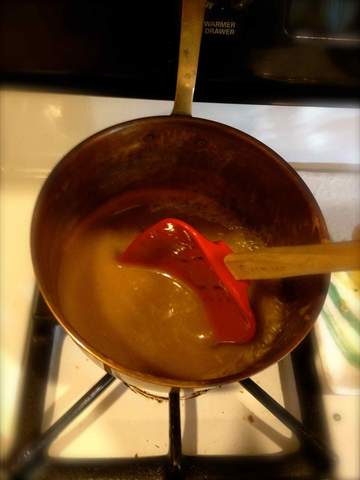 - Slowly over about 5 minutes add the Cocomels to coconut milk while stirring. Careful - don't burn the Cocomel on the bottom of the pot. Depending on the pot you are using, this might be more likely to happen. That's why I use a copper pot, the heat gets well dispersed and I'm less likely to have super-hot spots where the Cocomel will burn. The idea here is to get all the Cocomels dissolved in the coconut milk and boiling as a thick luscious sauce. If you add them too quick they become a big hunk and it takes longer.