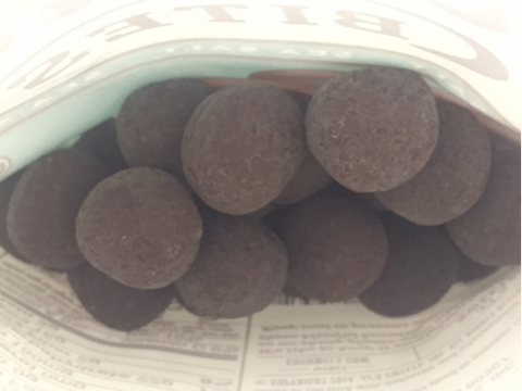 OK, so no glaze, but why the scuff marks?  Our Bites products that are covered in chocolate are done so via “panning”, which tumbles the creamy bites center as chocolate is sprayed onto them. As a result, Cocomel Bites are born rolling and tumbling over each other, leading to inevitable scuffs.